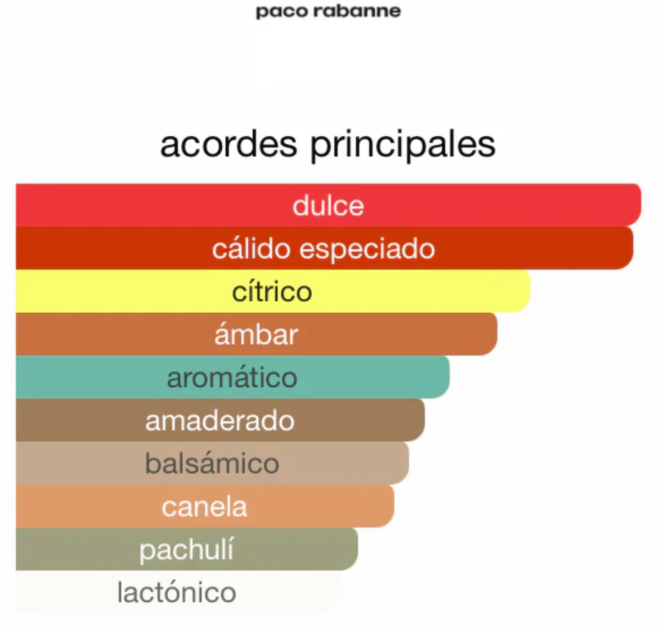 Notas principales: limón y salvia en la apertura, con un corazón dulce de canela y praline, y un fondo amaderado de pachulí y ámbar negro. Es fresca, dulce y con un toque oscuro que la hace única y seductora.