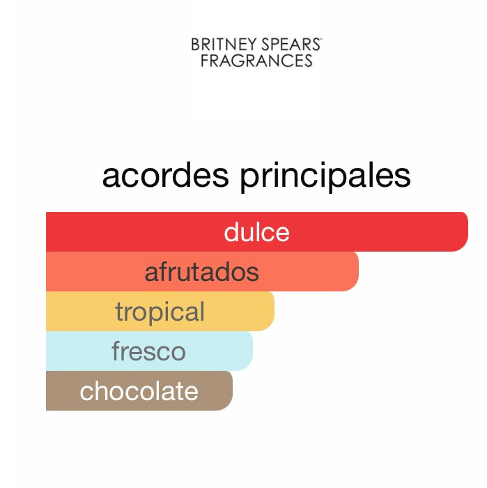 Fantasy de Britney Spears es un perfume dulce y seductor, ideal para quienes buscan una fragancia femenina y encantadora. Sus notas de salida combinan deliciosas frutas como el kiwi, el lichi rojo y el membrillo. En el corazón, destacan las notas florales de jazmín y orquídea, junto con el cremoso chocolate blanco. Finalmente, las notas de fondo envuelven con almizcle, maderas sensuales y un toque de raíz de iris. Perfecto para dejar una impresión inolvidable.