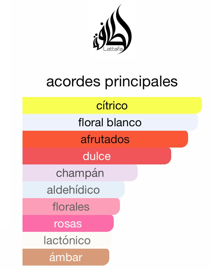 Haya de Lattafa combina acordes cítricos y afrutados 🍊🍓 con un toque floral blanco y champán 🌷🥂, aportando frescura y elegancia desde la primera impresión. Su corazón dulce y delicado envuelve la piel con feminidad y magnetismo 💖, mientras que sus notas de ámbar aportan un fondo cálido y duradero ✨.