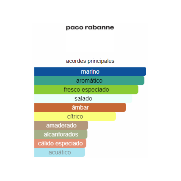 Las Notas de Salida son notas marinas, sal de mar y toronja (pomelo); las Notas de Corazón son hoja de laurel, geranio y especias; las Notas de Fondo son ámbar rojo y madera de gaiac.