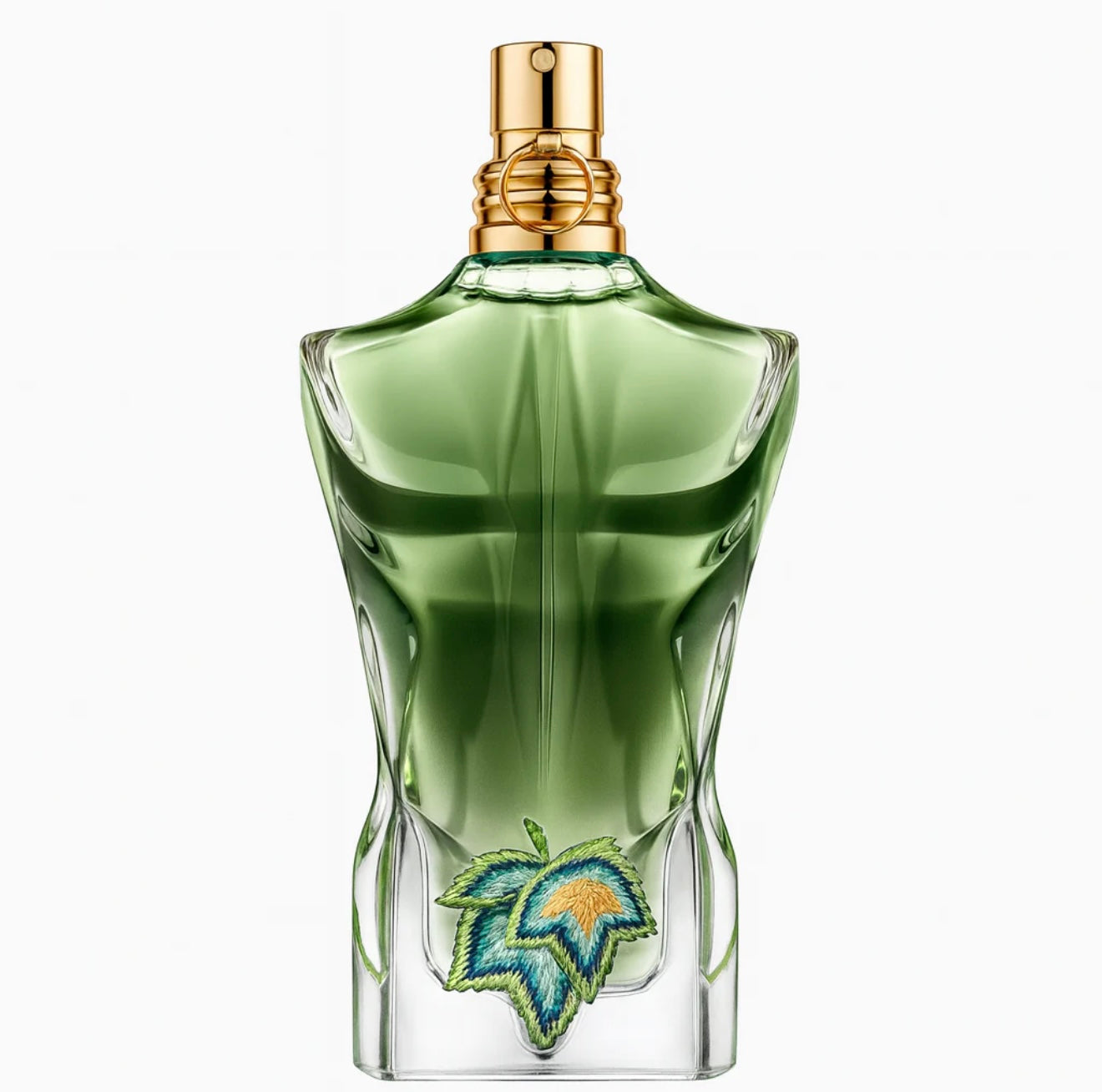 🔝 Presentación: Frasco icónico en forma de torso masculino, en tono verde translúcido, con detalles dorados y un diseño único que refleja la esencia del paraíso.