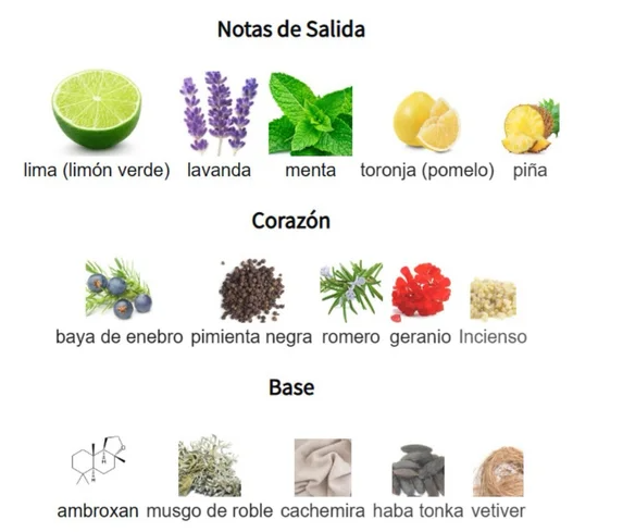 Corazón: Pimienta negra, bayas de enebro, romero fresco, geranio refinado e incienso envolvente