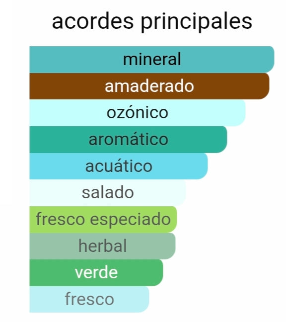 Las Notas de Salida son Notas minerales, hojas de violeta y sal; las Notas de Corazón son jengibre y salvia; las Notas de Fondo son notas amaderadas y vetiver.